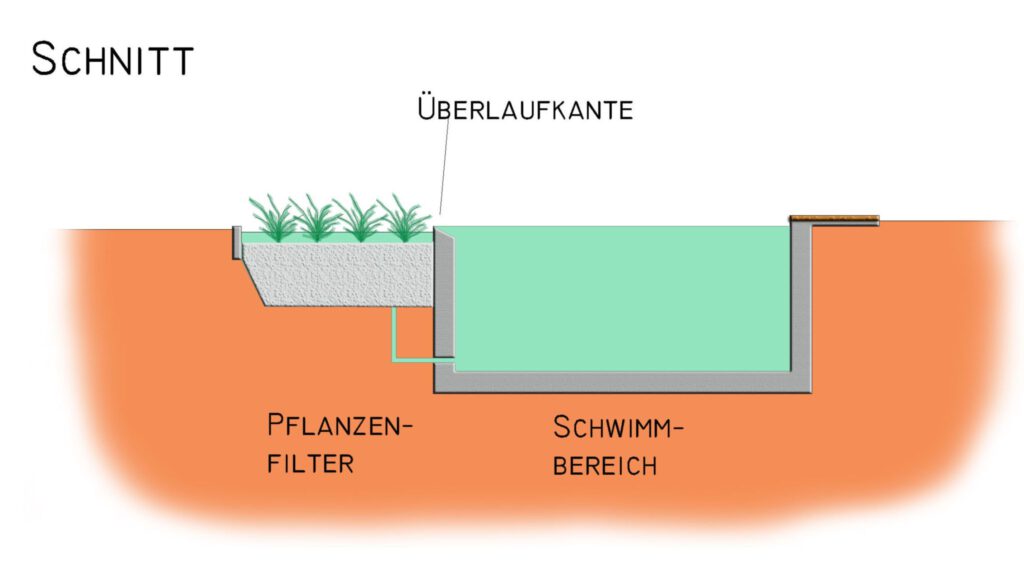 Wir bauen die meisten unserer Schwimmteiche mit einer Überlaufkante, die den Schwimmbereich vom Regenerationsbereich mit wasserreinigenden Pflanzen trennt. Mit der Überlaufkante haben wir eine gezielte Wasserführung, die es ermöglicht, das nährstoffreiche Oberflächenwasser gezielt aus dem Schwimmbereich in den Regenerationsbereich zu leiten, wo die wasserreinigenden Pflanzen ihre Arbeit leisten können. Mit einer Pumpe strömt das gereinigte Wasser über die Düsen zurück in das Becken. Die Kante dient zudem als bauliche Barriere, die verhindert, dass Substrat oder Pflanzenteile in den Schwimmbereich zurück rutschen.